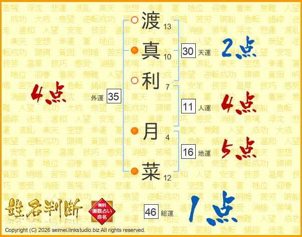 渡(13画)真(10画)利(7画) 月(4画)菜(12画)