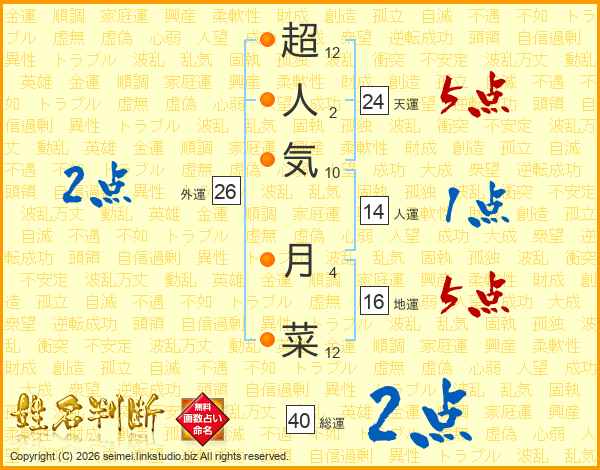 超(12画)人(2画)気(10画) 月(4画)菜(12画)