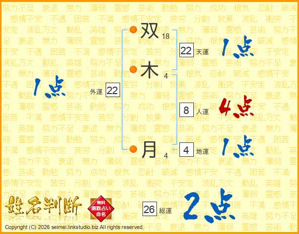 あなたの人生を表す1番重要な運勢です。生涯を通じて影響する総合運となり、主に50歳以降の晩年期に影響を及ぼします。苗字と名前の合計画数。