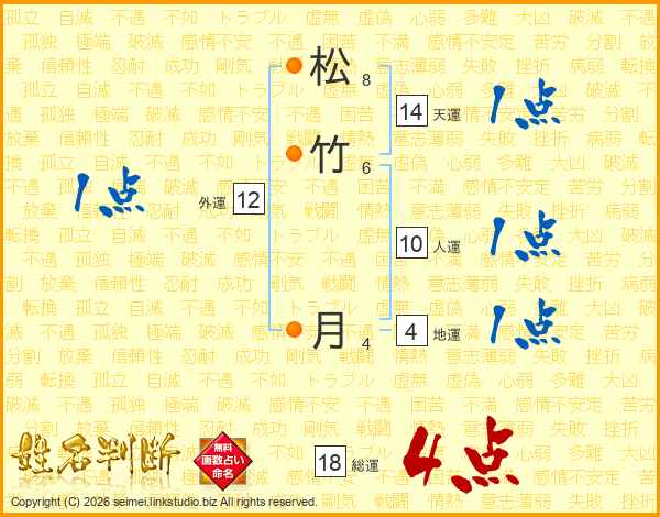 生活面を象徴する運勢です。外部から受ける影響力を表し、結婚運、家庭運や職場、環境への順応性を表します。総運から人運を引いた画数。姓や名が1文字の場合を除く。