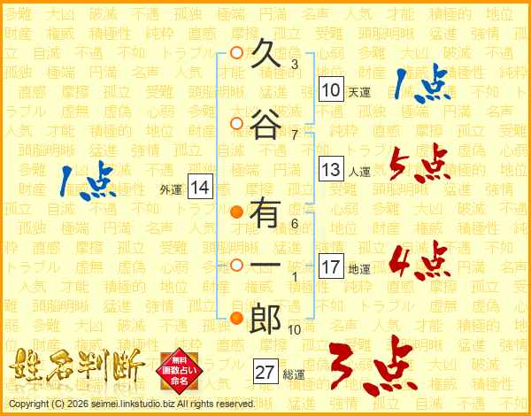 久(3画)谷(7画) 有(6画)一(1画)郎(10画)