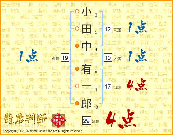 小(3画)田(5画)中(4画) 有(6画)一(1画)郎(10画)