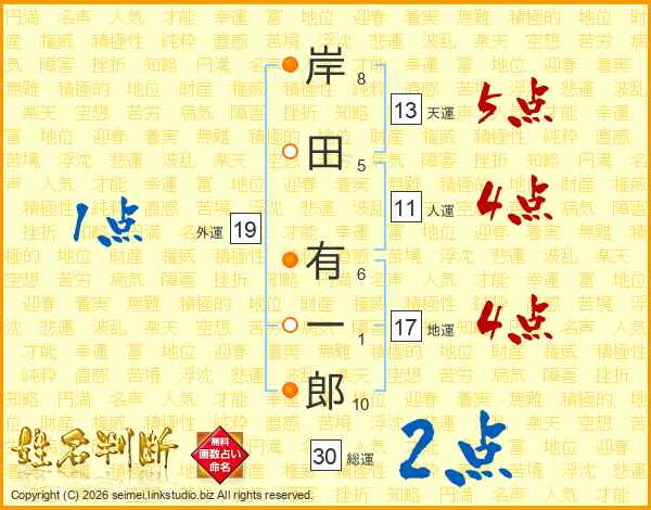 岸(8画)田(5画) 有(6画)一(1画)郎(10画)