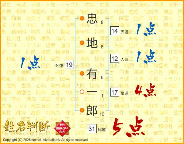 忠(8画)地(6画) 有(6画)一(1画)郎(10画)