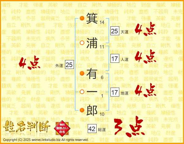 箕(14画)浦(11画) 有(6画)一(1画)郎(10画)