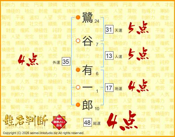 鷺(24画)谷(7画) 有(6画)一(1画)郎(10画)
