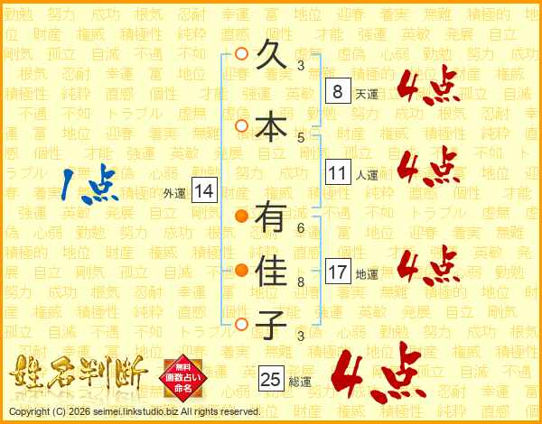 久(3画)本(5画) 有(6画)佳(8画)子(3画)