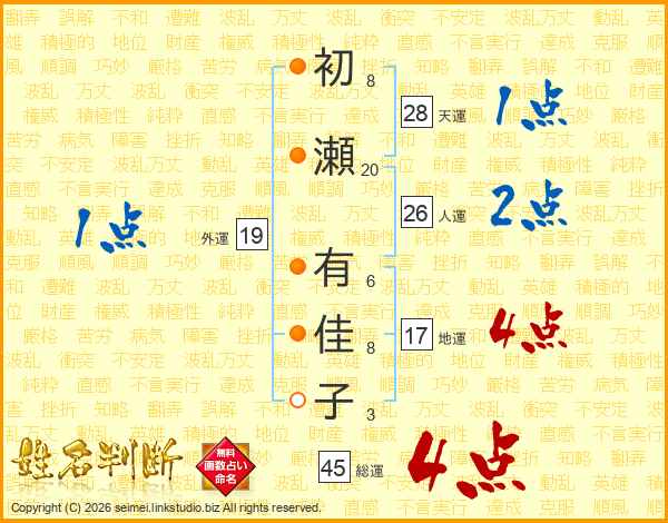 初瀬有佳子さんの人運は26画の2点!