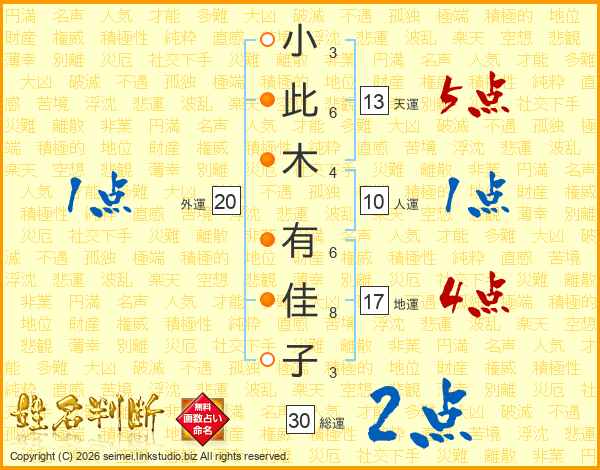 小(3画)此(6画)木(4画) 有(6画)佳(8画)子(3画)