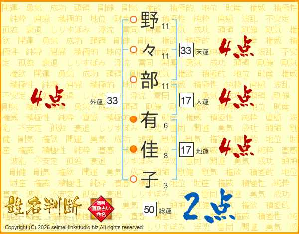 野(11画)々(11画)部(11画) 有(6画)佳(8画)子(3画)