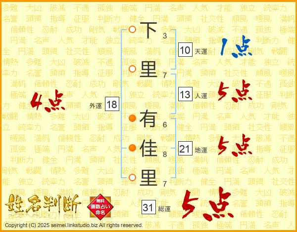 生活面を象徴する運勢です。外部から受ける影響力を表し、結婚運、家庭運や職場、環境への順応性を表します。総運から人運を引いた画数。姓や名が1文字の場合を除く。