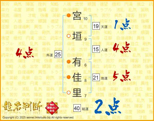 宮垣有佳里さんの総運は40画の2点!