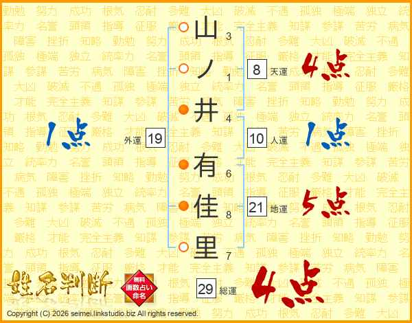 山ノ井有佳里さんの総運は29画の4点!