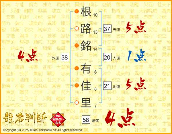 根(10画)路(13画)銘(14画) 有(6画)佳(8画)里(7画)