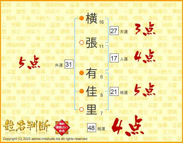 横(16画)張(11画) 有(6画)佳(8画)里(7画)