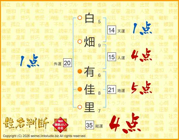 白(5画)畑(9画) 有(6画)佳(8画)里(7画)