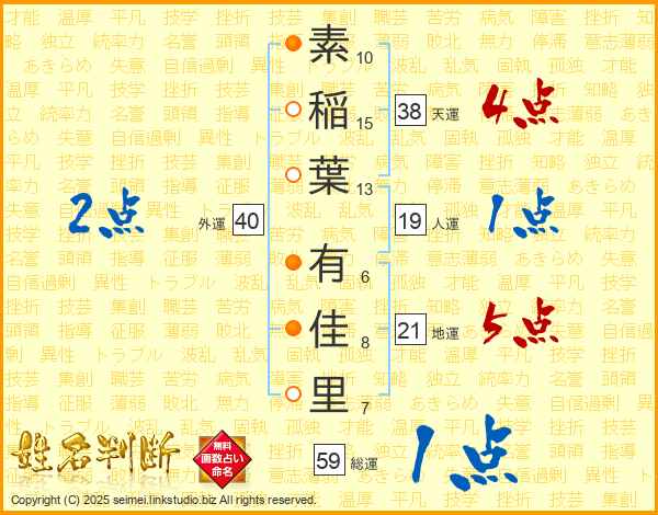 素(10画)稲(15画)葉(13画) 有(6画)佳(8画)里(7画)