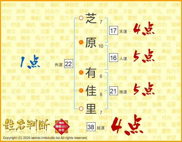 芝(7画)原(10画) 有(6画)佳(8画)里(7画)
