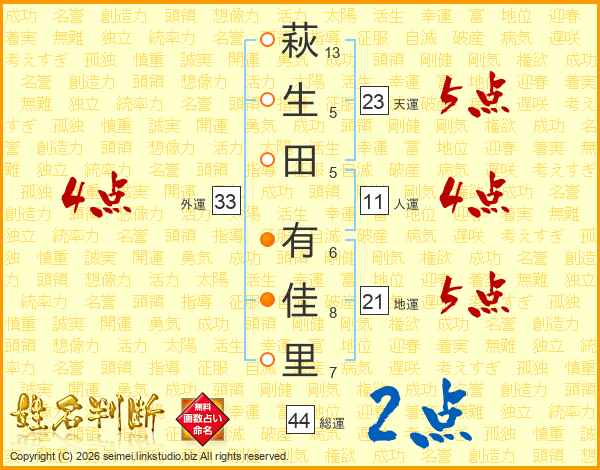 萩(13画)生(5画)田(5画) 有(6画)佳(8画)里(7画)