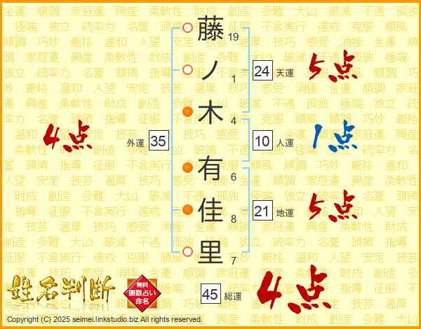 藤(19画)ノ(1画)木(4画) 有(6画)佳(8画)里(7画)