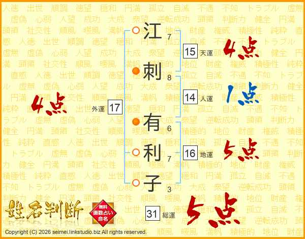 生活面を象徴する運勢です。外部から受ける影響力を表し、結婚運、家庭運や職場、環境への順応性を表します。総運から人運を引いた画数。姓や名が1文字の場合を除く。