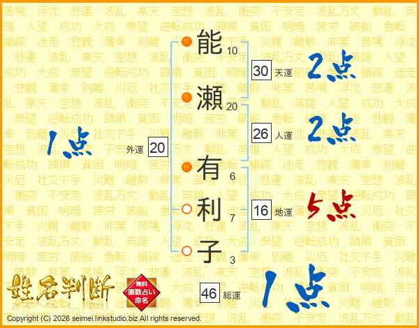 能瀬有利子さんの総運は46画の1点!
