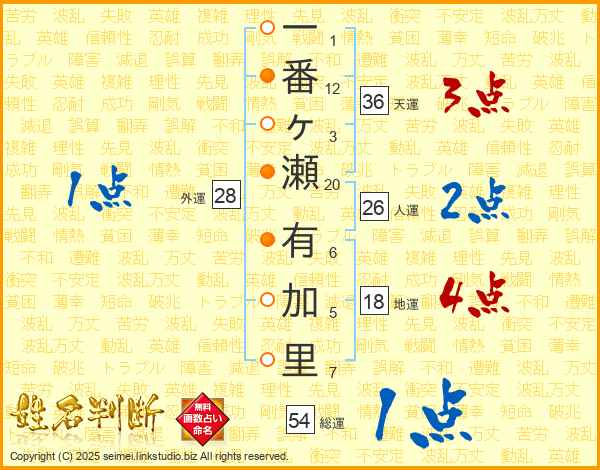 一番ヶ瀬有加里さんの総運は54画の1点!