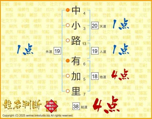 生活面を象徴する運勢です。外部から受ける影響力を表し、結婚運、家庭運や職場、環境への順応性を表します。総運から人運を引いた画数。姓や名が1文字の場合を除く。