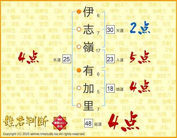 伊(6画)志(7画)嶺(17画) 有(6画)加(5画)里(7画)