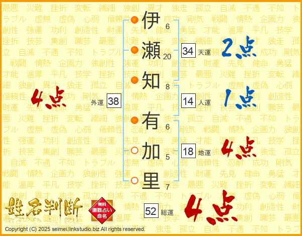 伊(6画)瀬(20画)知(8画) 有(6画)加(5画)里(7画)