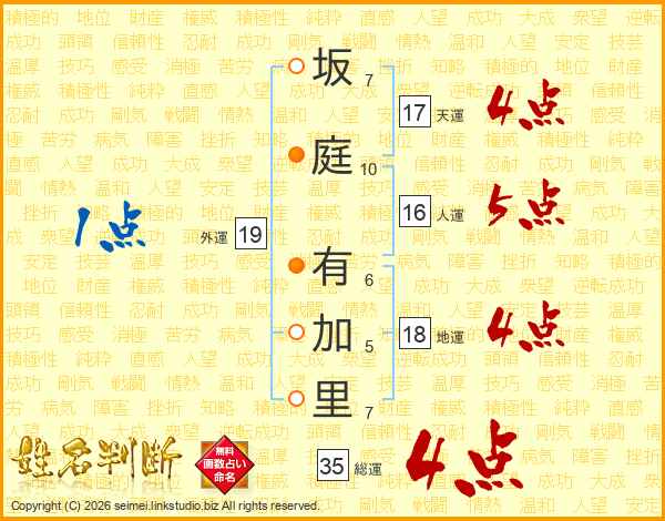 坂(7画)庭(10画) 有(6画)加(5画)里(7画)