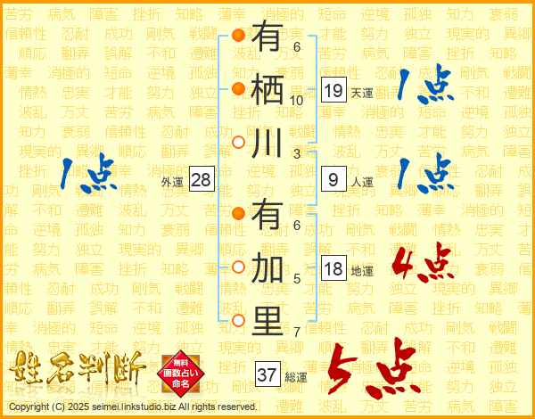 有栖川有加里さんの総運は37画の5点!