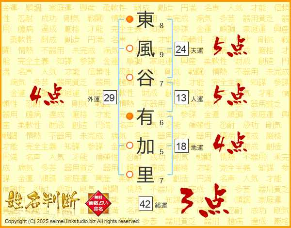 東(8画)風(9画)谷(7画) 有(6画)加(5画)里(7画)