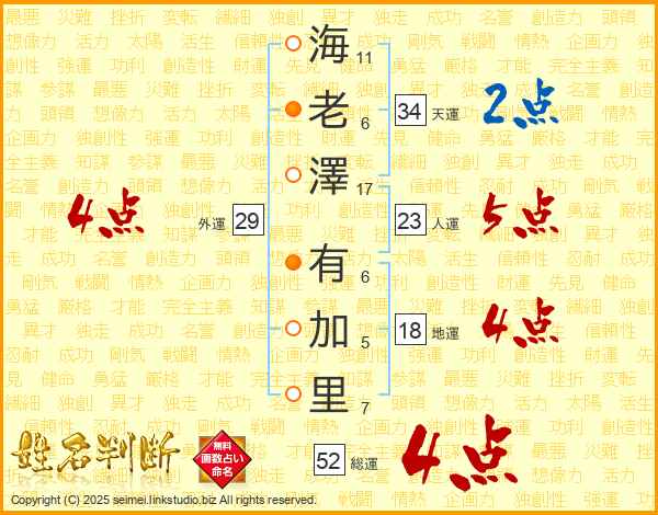 海(11画)老(6画)澤(17画) 有(6画)加(5画)里(7画)
