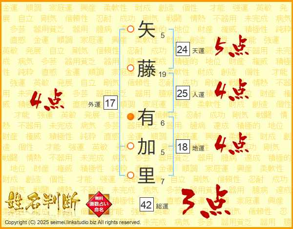矢(5画)藤(19画) 有(6画)加(5画)里(7画)