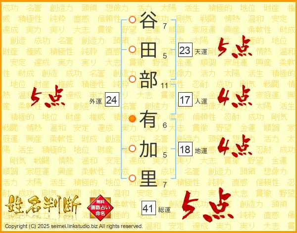 谷(7画)田(5画)部(11画) 有(6画)加(5画)里(7画)