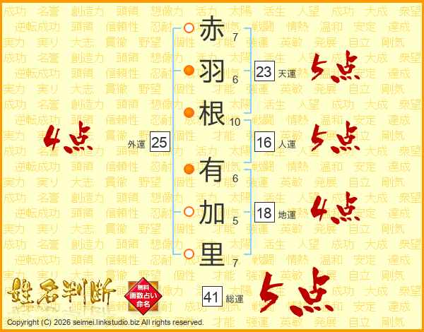 赤(7画)羽(6画)根(10画) 有(6画)加(5画)里(7画)