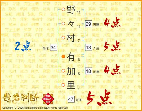 野(11画)々(11画)村(7画) 有(6画)加(5画)里(7画)