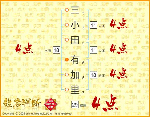 三(3画)小(3画)田(5画) 有(6画)加(5画)里(7画)