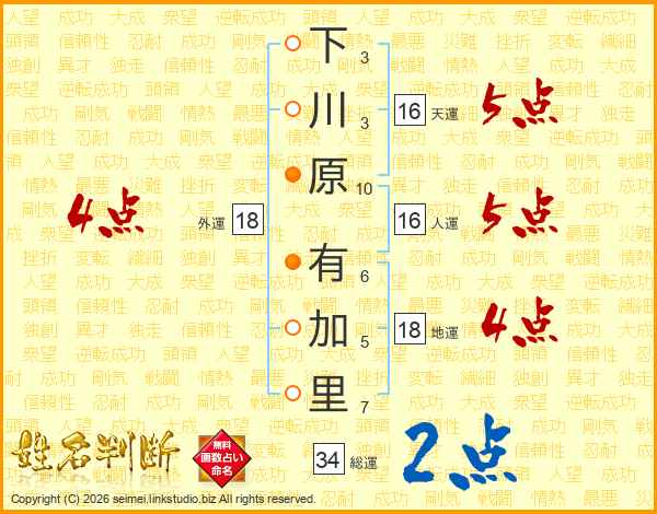 下(3画)川(3画)原(10画) 有(6画)加(5画)里(7画)