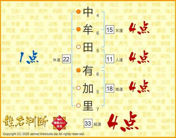 中(4画)牟(6画)田(5画) 有(6画)加(5画)里(7画)