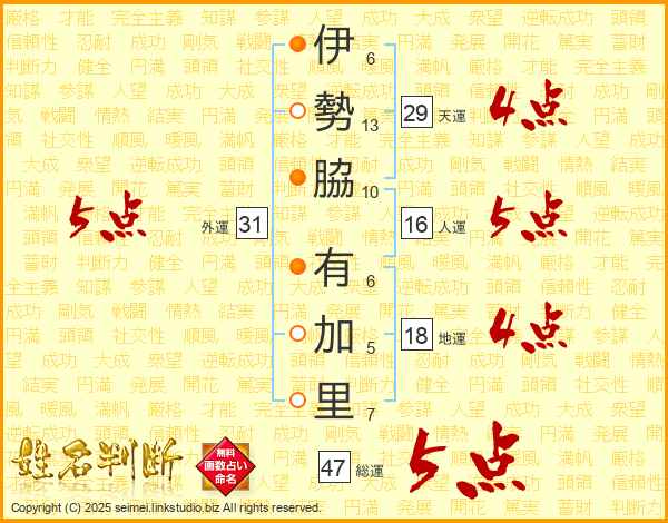 伊(6画)勢(13画)脇(10画) 有(6画)加(5画)里(7画)