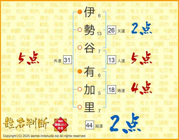 伊(6画)勢(13画)谷(7画) 有(6画)加(5画)里(7画)
