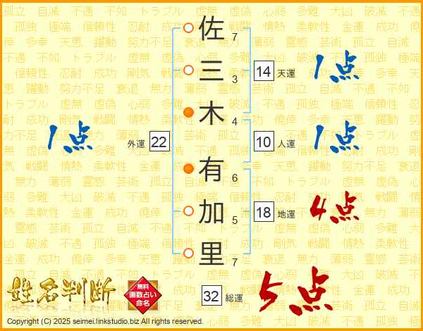 佐(7画)三(3画)木(4画) 有(6画)加(5画)里(7画)