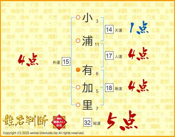 小(3画)浦(11画) 有(6画)加(5画)里(7画)