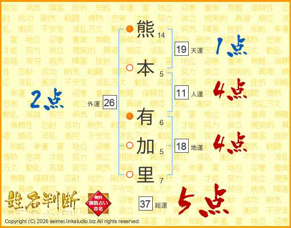 熊(14画)本(5画) 有(6画)加(5画)里(7画)