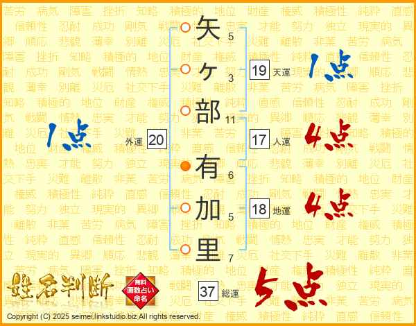 矢(5画)ヶ(3画)部(11画) 有(6画)加(5画)里(7画)