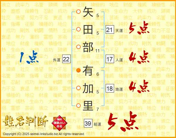 矢(5画)田(5画)部(11画) 有(6画)加(5画)里(7画)
