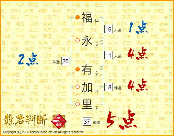 福(14画)永(5画) 有(6画)加(5画)里(7画)