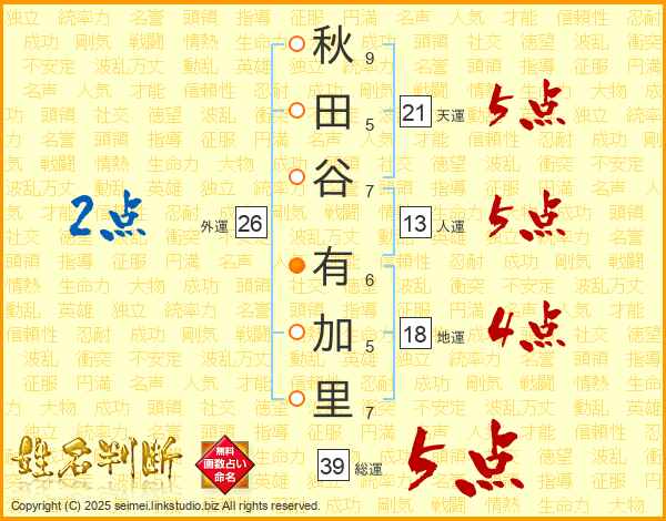 秋(9画)田(5画)谷(7画) 有(6画)加(5画)里(7画)